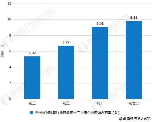 2017年全國(guó)環(huán)保設(shè)備行業(yè)營(yíng)收前十二上市企業(yè)市場(chǎng)占有率統(tǒng)計(jì)情況
