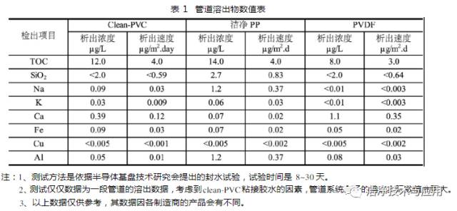 選擇管材的依據(jù)主要是管道的溶出物(見表1)及內表面光潔度。主要應用的管道有Clean-PVC管、潔凈PP管、PVDF管幾種。Clean-PVC管采用耐沖擊硬質聚氯乙烯制造,其比普通PVC管含有較少的添加劑。從而減小了管道內壁的粗糙度(Clean-PVC管的表面粗糙度小于0.37 μm,而普通PVC管的表面粗糙度在1.0 μm)以及污染物的析出。制造商主要有“積水國際貿易有限公司(SEKISUI)”、“日本旭有機材株式會社(ASAHI AV)”。潔凈PP管材質為(β)-PP-H均聚型聚丙烯,具有非常均一、致密的結構和出眾的抗沖擊強度。其高結晶度確保了極好的耐化學品性能,二氧化鈦色素的使用進一步提高了此特性。其內壁粗糙度及污染物的析出性能與Clean-PVC接近。制造商主要有喬治.費歇爾管路系統(tǒng)有限公司(+GF+)。PVDF管材質為聚偏二氟乙烯,是一種高結晶度,純水設備高性能熱塑性塑料,可用溫度/壓力范圍廣。其主要特性是力學強度高、韌性好、具有優(yōu)異的耐磨性、熱穩(wěn)定性和介電性,其純度高,能熔融成型,對于大多數(shù)化學品和溶劑都具有很好的耐腐蝕性、抗紫外線和核輻射性能好、耐候性好、耐生物菌類的作用、氣體和液體阻隔性好、阻燃性好、發(fā)煙量少等優(yōu)點。聚偏二氟乙烯是一種純凈的材料,它不含任何添加劑,且其表面光滑,粗糙度小于0.2μm。制造商主要有喬治?費歇爾管路系統(tǒng)有限公司(+GF+)、奧地利AGRU公司。