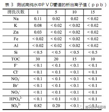 如表2所示,8英寸半導體對純水水質指標的要求相當嚴格,Clean-PVC及潔凈PP已不能滿足其要求,而PVDF管道的溶出物及管道內壁光潔度都遠強于Clean-PVC及潔凈PP,故而只能選擇PVDF管道。在國內的半導體生產中也有8英寸采用Clean-PVC管道的成功案例,但經過實測分析后發(fā)現(xiàn),這類生產廠的產品都是從6英寸升級至8英寸的,也就是在6英寸純水管道系統(tǒng)運行若干年后升級為8英寸的,而Clean-PVC管路系統(tǒng)經過長時間運行后,其溶出的離子呈逐步減少的趨勢。以某電子廠為例,一期廠房純水系統(tǒng)未設置專門的除TOC紫外線燈,僅依靠制備過程中對TOC的去除,在運行了若干年后,其回水管道TOC可以達到15ppm,而二期新建的純水系統(tǒng),設置了專用的除TOC紫外線燈,在系統(tǒng)開始運行階段的站房出口TOC,也只有50 ppm。正是由于這種特性,所以純水系統(tǒng)在投產前需經過相當長時間的沖洗運行。所以在從6英寸升級到8英寸的生產中,經過若干年沖洗的Clean-PVC管道也是有可能達到使用要求的。而PVDF管道可以在短時間內沖洗到較低的指標,如表3所示。為了節(jié)省初投資,純水回水管道可以采用Clean-PVC或者潔凈PP管代替PVDF,由于純水回水需經過拋光系統(tǒng)的再次處理,所以即使回水中有較多的溶出物也不影響供水的水質,只是會影響拋光系統(tǒng)的維護費用,但長時間運行后維護費用的差別會逐步減小。